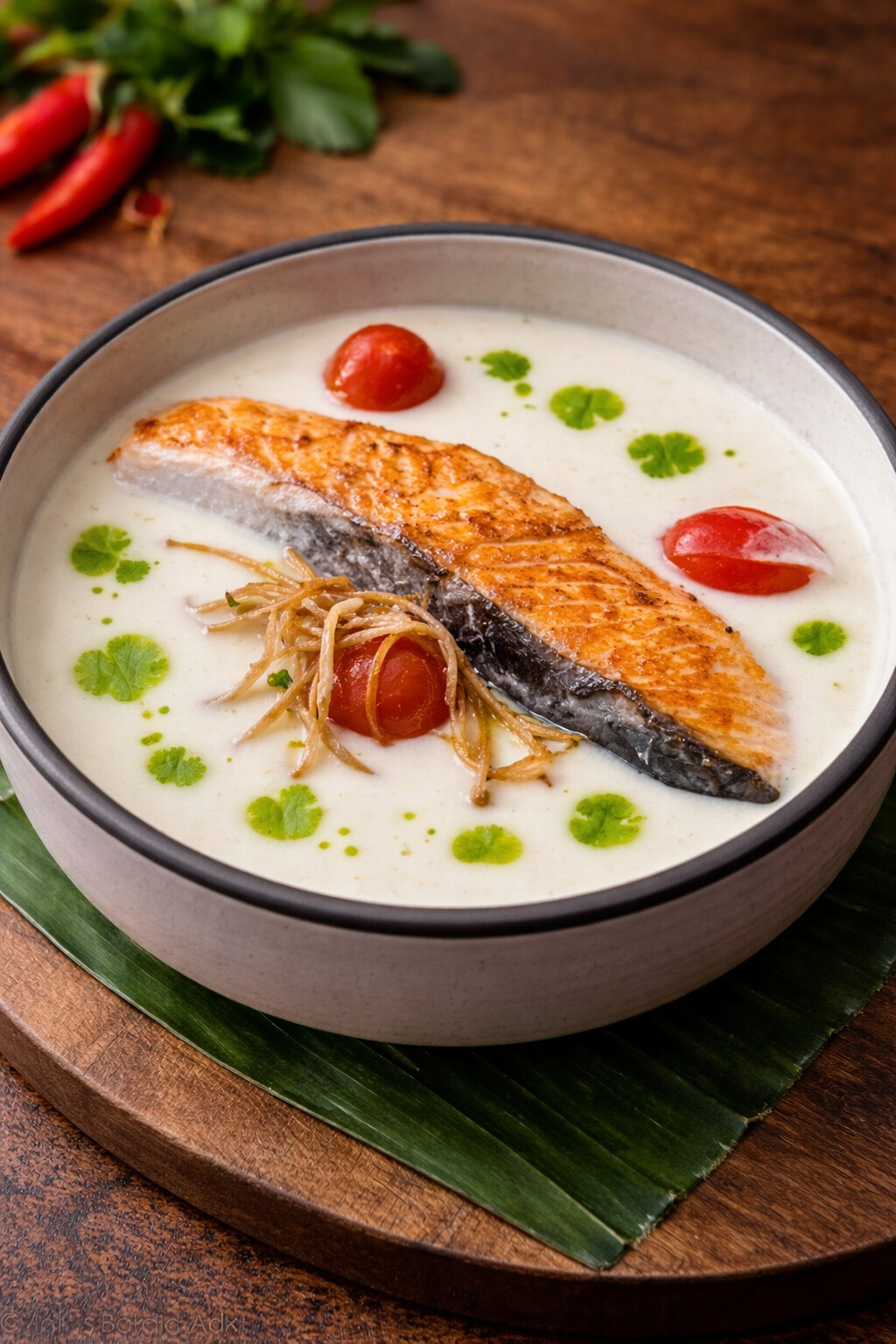 Sous-vide salmon with mushrooms, tomatoes and spinach in tom kha cream sauce