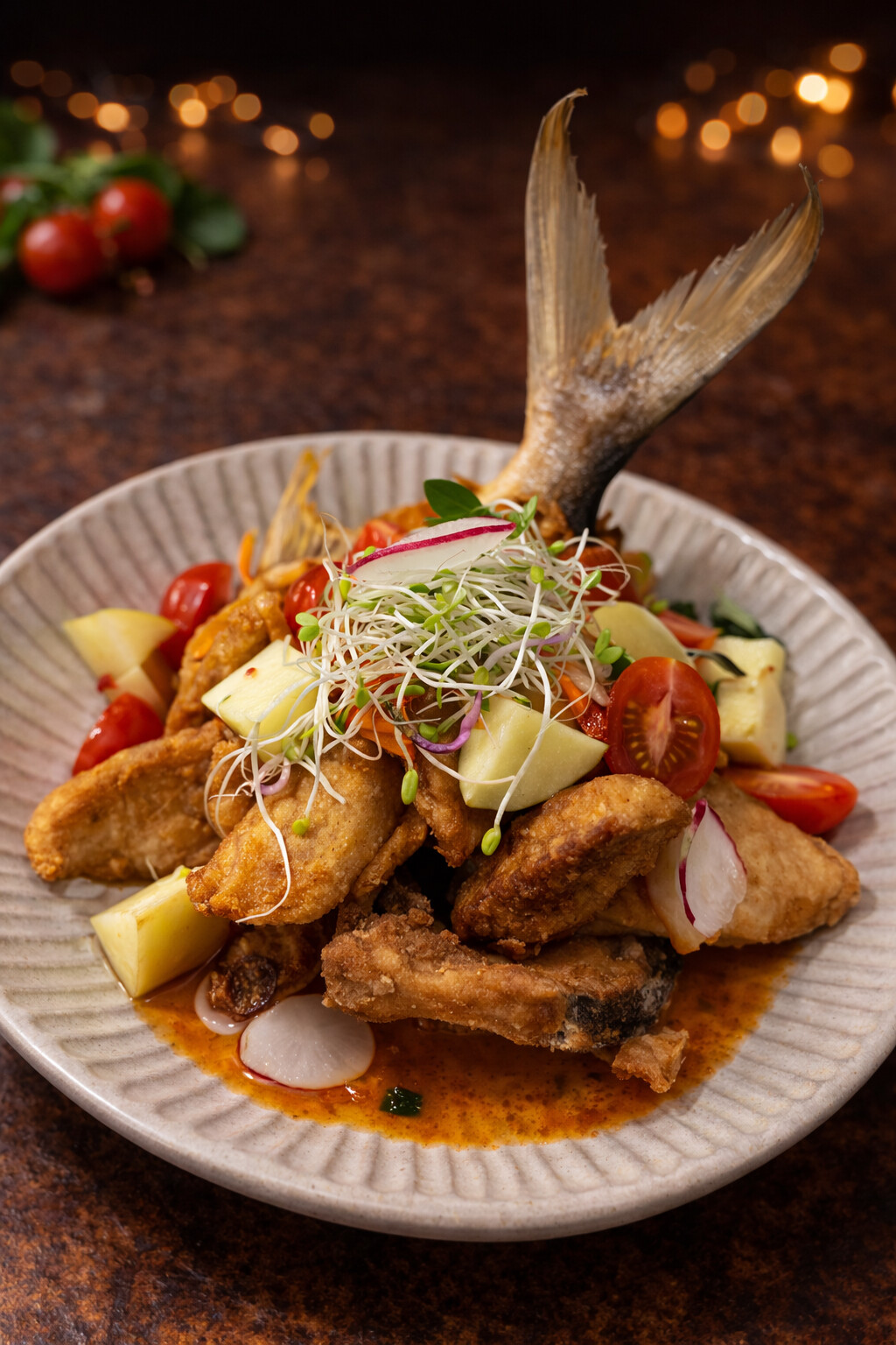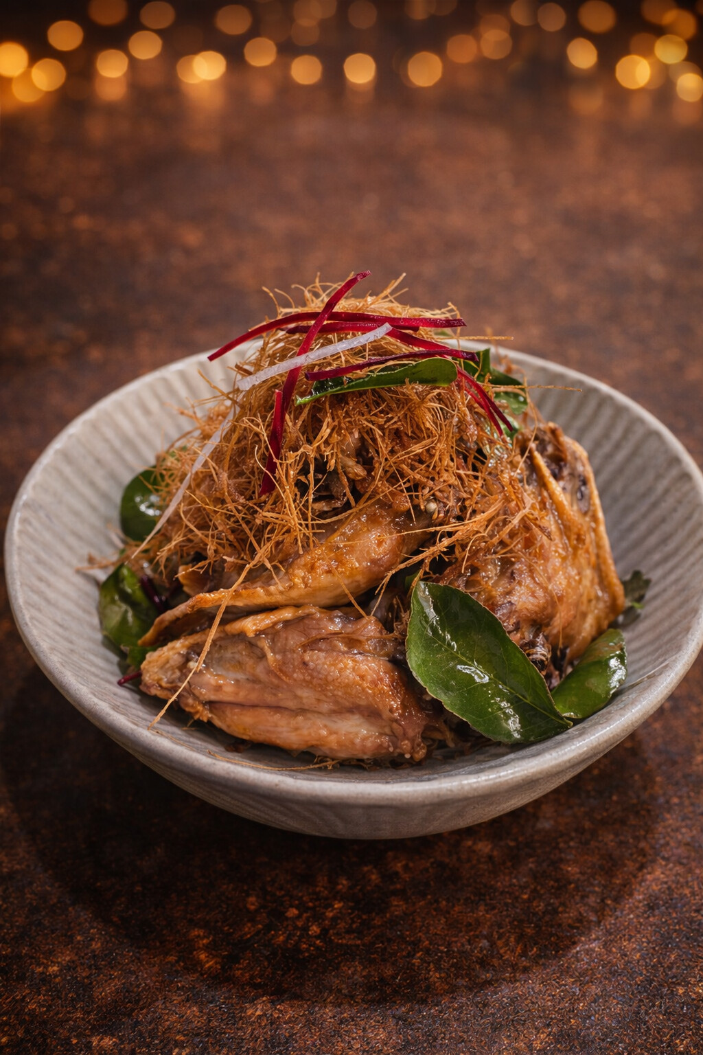 Golden fried flat wings topped with crispy lemongrass and kaffir lime leaves