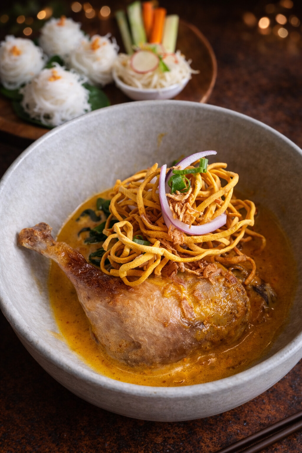Duck confit leg with egg noodles in northern Thai curry
