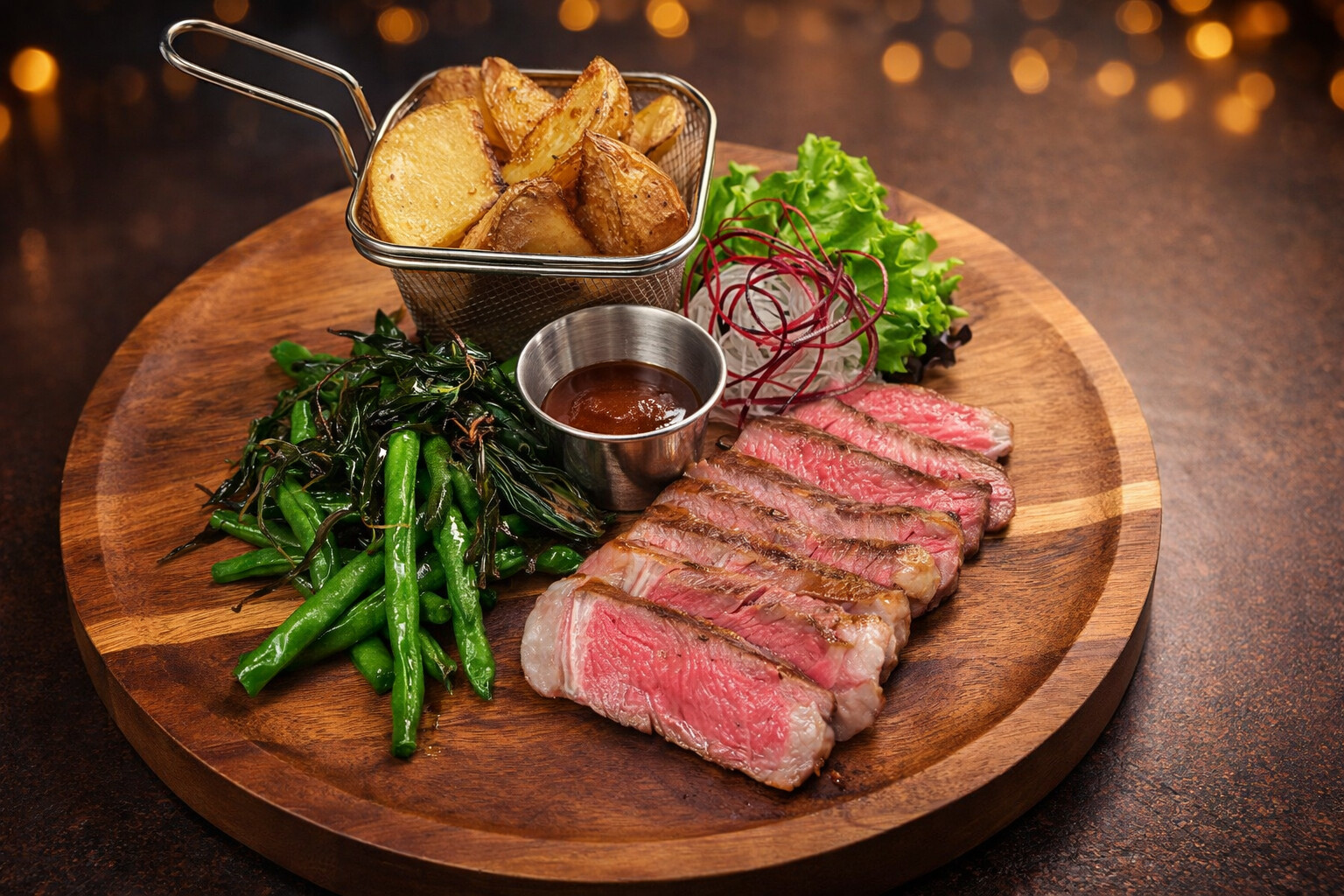 Grilled ribeye served with spicy basil sauce, green beans and potatoes