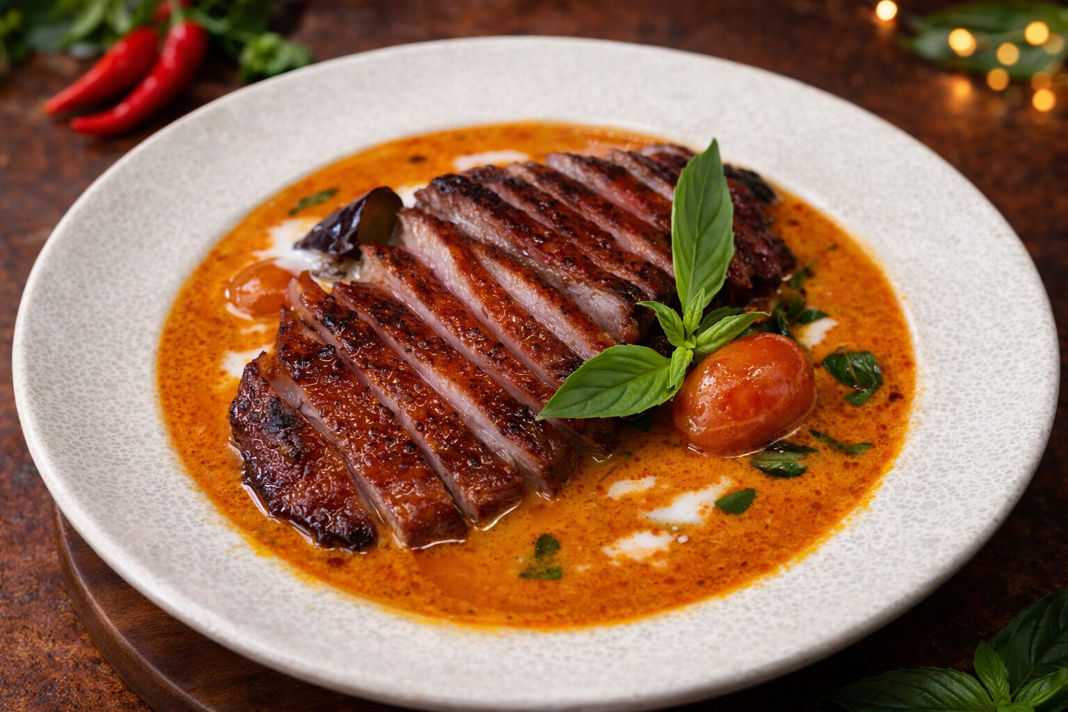 Roasted duck breast with red curry, pineapple and Thai basil